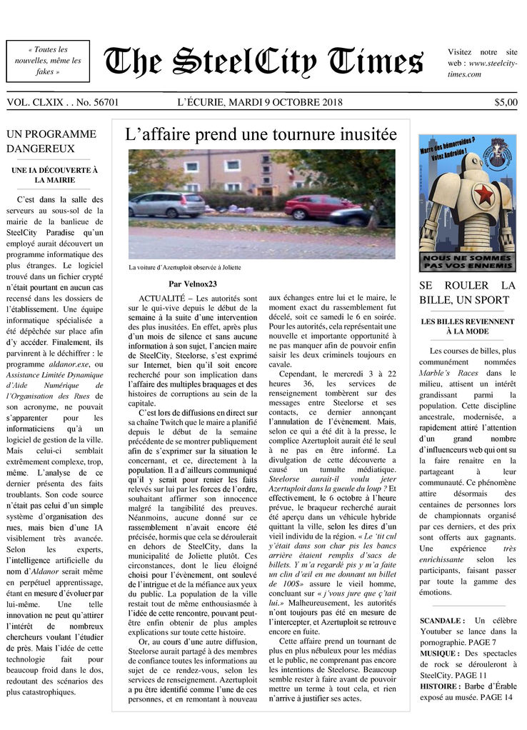 Découvrez toute l’actualité de l’Écurie avec The SteelCity Times, le plus primé de tous les journaux de SteelCity (et le seul) ! À chaque mois, voyez les nouvelles du Twitch et du Discord de Steelorse, et les avis de nos éditeurs passionnés ! Bon… vous vous demandez surement : Kossé-ça s’te journal là ? Eh bien, laissez-moi vous expliquer… Tout part de niaiseries sans importance. J’écoute tranquillement un live de Steelorse, et m’amuse à faire le journaliste dans le tchat comme j’aimais et le faisais souvent. Soudainement, un gars qui a une trop grande et étrange fixation sur les pizzas-pochettes me demande d’en faire un scoop. Trop à l’aise, j’accepte (en niaisant, je tiens à le préciser) le défi. Puis, ce qui dû arriver arriva. Steel tourne le regard vers le tchat… lit ma connerie… et me voilà d’un coup obligé de faire une nouvelle de journal sur les effets psychologiques de la congélation des pizzas-pochettes. Juste ça ! Alors, devinez ce que j’ai fait ? Un scoop sur les pizzas-pochettes ! Et c’est en présentant le fruit de ce défi (que Steelorse avait fini par oublier, soit dit en passant) quelques semaines plus tard que commence officiellement The SteelCity Times. Ouf ! C’est donc à 14 ans et ¾ précisément que je me retrouve, Velnox23 de mon pseudo, responsable d’un journal peu professionnel et très ludique pour le grandiose Steelorse, et que je partage ici avec vous ! Un projet qui, je l’espère bien, finira par se concrétiser, mais surtout que vous apprécierez !